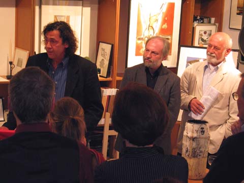 Zu Gast zur Vernissage war auch der Verleger Volker Dittrich vom Dittrich Verlag, Köln. Im Dittrich Verlag erscheint jetzt die Werkausgabe von Edgar Hilsenrath. Christian Lang erstellt zu jedem Buch eine Farbradierung mit der Auflage von 30 Exemplaren. Edgar Hilsenraths Bücher sind in 18 Sprachen übersetzt, in 22 Ländern veröffentlicht. |